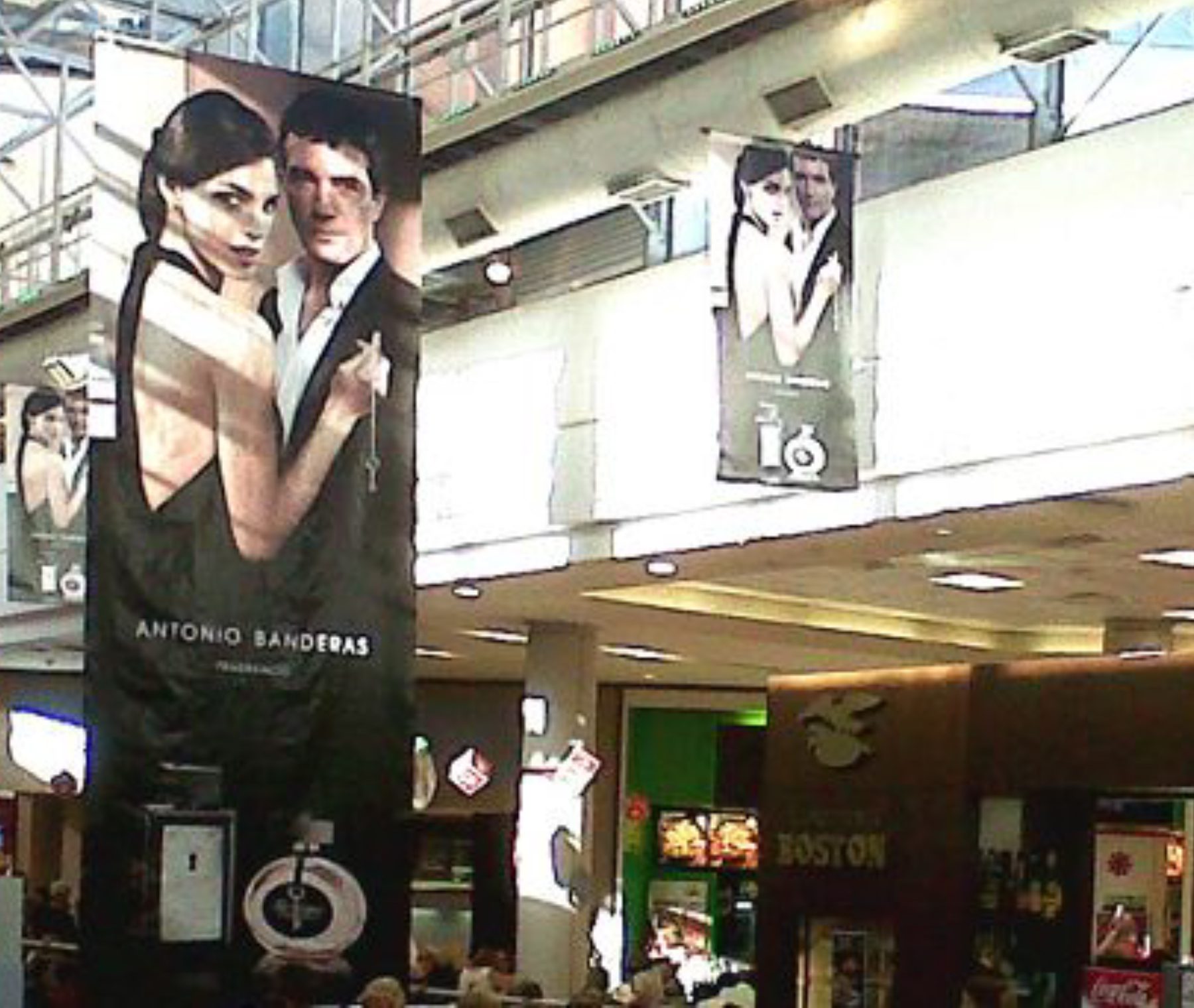Banners bifaz impresos en lona vinílica de alta definición ubicados sobre luminarias del shopping en áreas de circulación.