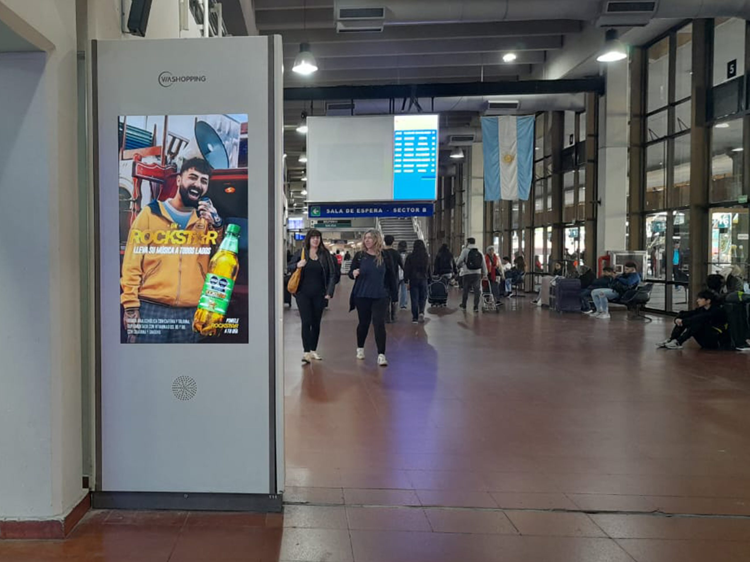 Circuito de Tótems Digitales con Pantallas Led TV Full HD ubicados en espacios destacados que aseguran la visibilidad de todos los pasajeros.